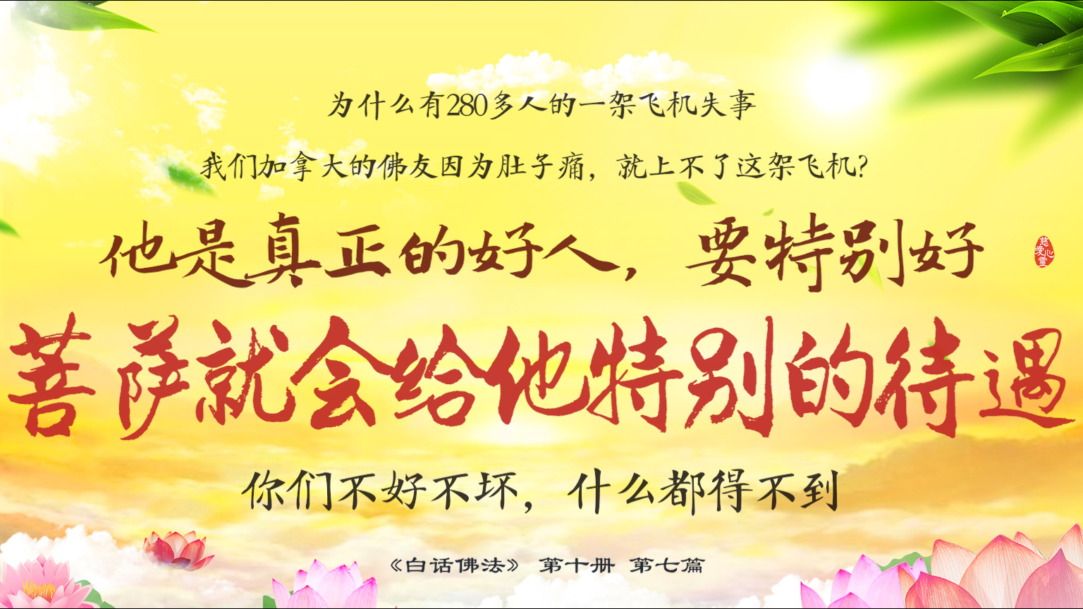 那么在这一万个人里面,修心的好人碰到灾难会发生什么事情呢?菩萨会把他调出来,比如让他去出差,因为他头上的光环很亮,护法神会做这个工作的。所以地震的时候,有很多人正好出差,或者不在房子里面,这都是菩萨保佑。为什么有280多人的一架飞机失事,我们加拿大的佛友因为肚子痛,就上不了这架飞机?他是真正的好人,要特别好,菩萨就会给他特别的待遇。你们不好不坏,什么都得不到。希望你们要懂得,若能灭无明,你就不会堕落十二因缘。如果你能够没有无明,就是灭掉你自己的无明,你们知道灭掉无明靠什么吗?师父现在给你们讲课就是把你们的无明灭掉,你们知道吗?你们从师父的课里面,知道有多少事情可以做,有多少事情不能做,你们就是明白了,你们就是灭无明,你们就不会因为无明堕入六道轮回了。