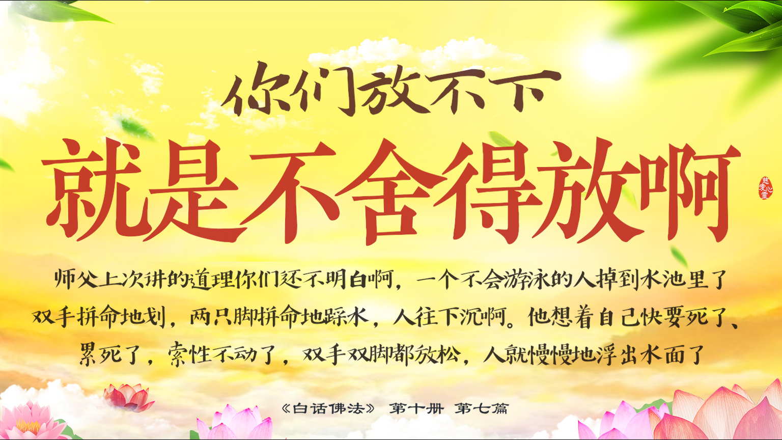 你们放不下,就是不舍得放啊,师父上次讲的道理你们还不明白啊,一个不会游泳的人掉到水池里了,双手拼命地划,两只脚拼命地踩水,人往下沉啊。他想着自己快要死了、累死了,索性不动了,双手双脚都放松,人就慢慢地浮出水面了。你们现在还不明白吗?道理全部在人间啊,你们想破除无明,不堕落十二因缘,你们一定要有师父教导你们。你们是多么的幸福啊,师父小时候就没有这么一个师父来教导自己。没想到师父多年的苦修,开悟解脱,你们看师父现在是多么的幸福啊。