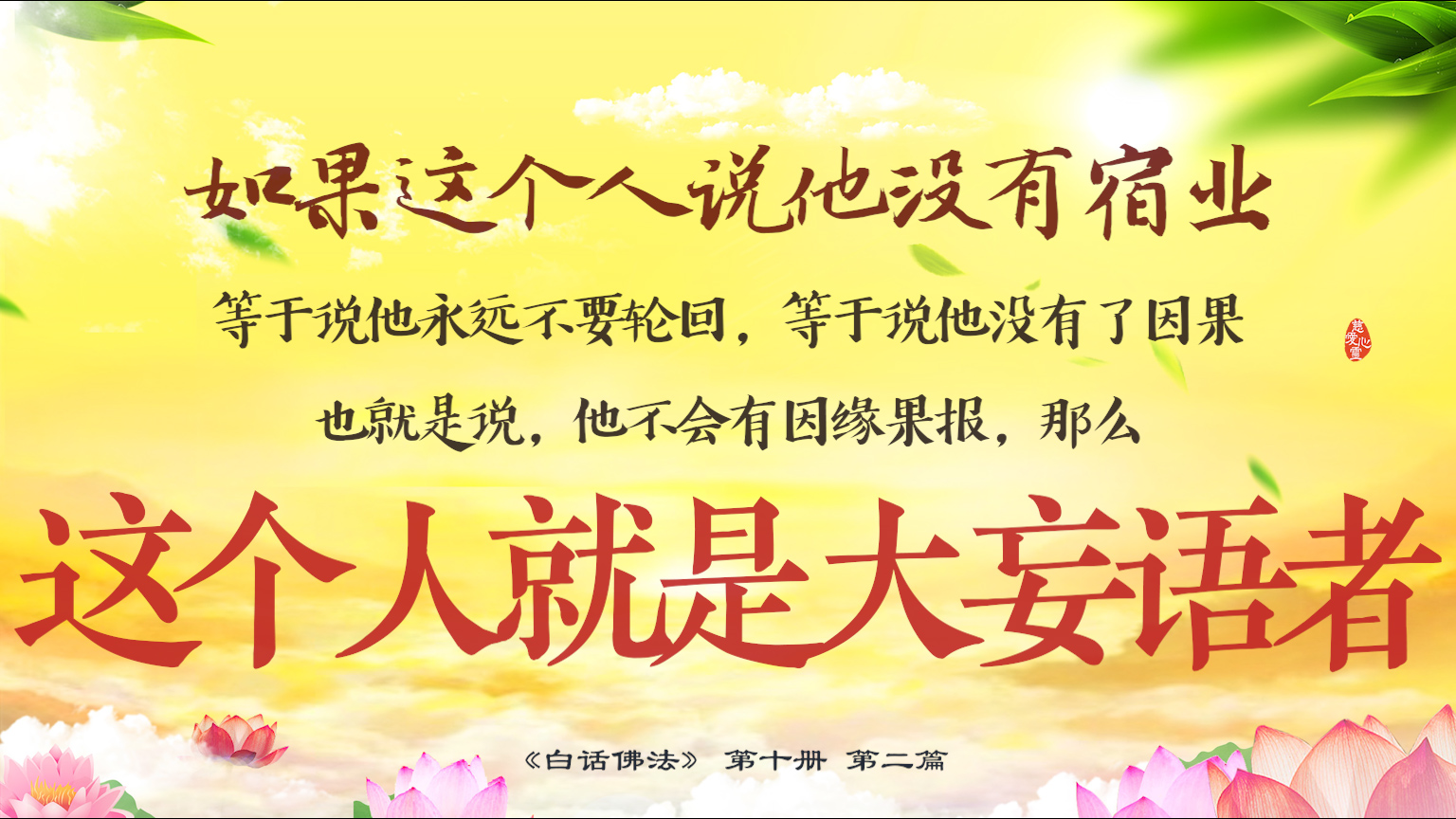 师父告诉你们,我们都有宿业,其实每个人自己的 宿业都在排队等着我们。是不是等着你们啊?39岁的时 候劫来了,49岁的时候劫来了,一会儿一个事情,是不 是等着你们?这就是你们的宿业,过去的业障。如果这 个人说他没有宿业,等于说他永远不要轮回,等于说他 没有了因果,也就是说,他不会有因缘果报,那么这个 人就是大妄语者。师父为什么要说这句话呢?就是告诉 你们,一个人说没有前世,他就是一个大欺骗家,就是 一个大妄语家。你不承认前世、宿业,你就相当于说, 我没有因果了,你是违反了天理。